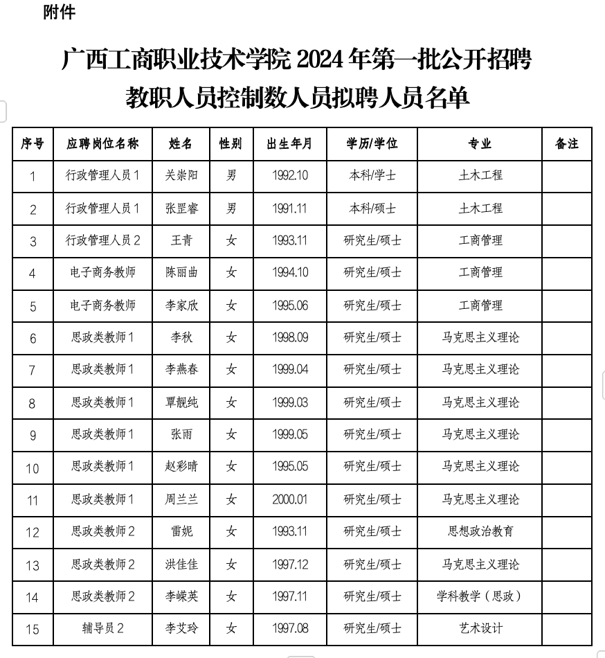 附件:廣西工商職業(yè)技術(shù)學院2024年第一批公開招聘教職人員控制數(shù)人員擬聘人員名單