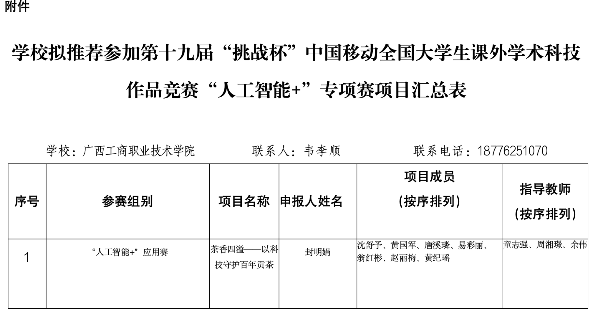 附件:學(xué)校擬推薦參加第十九屆“挑戰(zhàn)杯”中國(guó)移動(dòng)全國(guó)大學(xué)生課外學(xué)術(shù)科技作品競(jìng)賽“人工智能+”專項(xiàng)賽項(xiàng)目匯總表