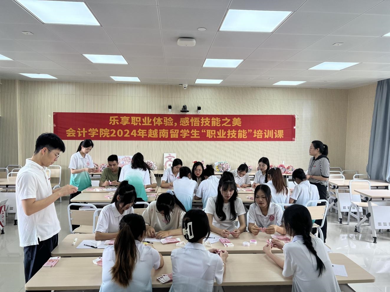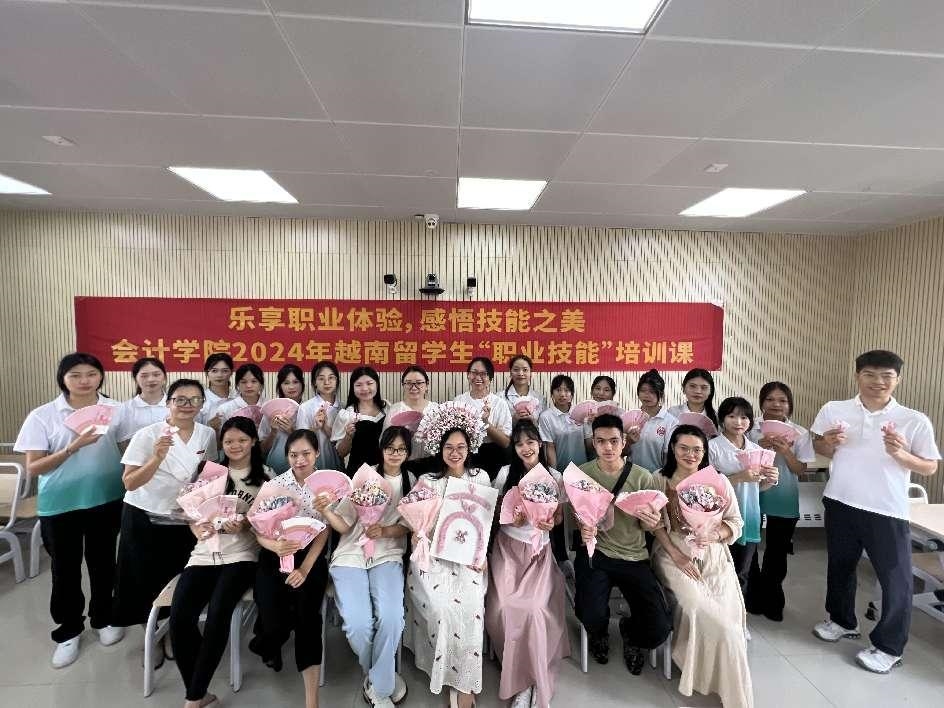 為貫徹落實“一帶一路”倡議,深入貫徹黨的二十大精神,更好地切實推進加強與東盟國家的教育交流,推進與東盟國家的職業(yè)教育合作,同時進一步推進學院國際交流相關(guān)工作。我院于6月26日在武鳴校區(qū)A2-305教室舉辦“樂享職業(yè)體驗,感悟技能之美”—— 2024年越南留學生混班研學培訓課程。本次活動旨在通過混班研學,讓越南留學生深入體驗中國會計職業(yè)的魅力,由我院鐘小林老師主講。