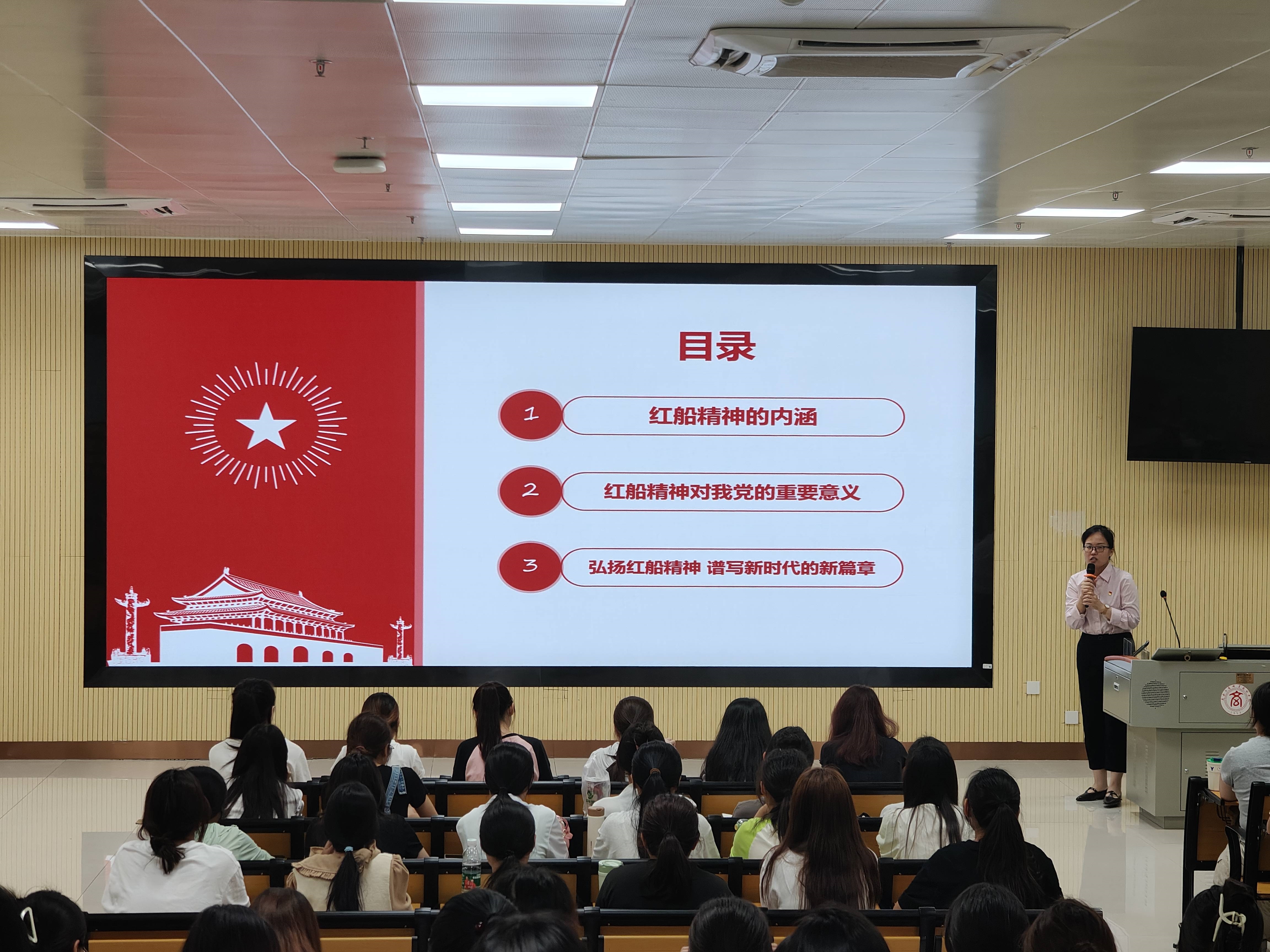 課程開始,周思池老師從紅船精神的內(nèi)涵、紅船精神對我黨的重要意義、弘揚(yáng)紅船精神,譜寫新時代的新篇章三個方面給大家講述了什么是紅船精神。紅船精神具有“開天辟地、敢為人先的首創(chuàng)精神”,“堅定理想、百折不撓的奮斗精神”,“立黨為公、忠誠為民的奉獻(xiàn)精神”。1921年,中國共產(chǎn)黨第一次全國代表大會在浙江嘉興南湖的一條游船(后稱“紅船”)上勝利閉幕,莊嚴(yán)宣告中國共產(chǎn)黨的誕生。從此,中國的新民主主義革命就有了堅強(qiáng)的領(lǐng)導(dǎo)者——中國共產(chǎn)黨。中國共產(chǎn)黨一直秉承紅船的創(chuàng)新精神,不斷開拓進(jìn)取,帶領(lǐng)中國人民走向民族復(fù)興。周思池老師強(qiáng)調(diào),紅船精神是重要精神航標(biāo),具有巨大的精神能量,在新時代的美好時期,弘揚(yáng)和踐行革命紅船精神將更好地激勵當(dāng)代青年大學(xué)生勇敢地?fù)?dān)當(dāng)起時代賦予的歷史使命和社會責(zé)任,促使我們勇于創(chuàng)新、艱苦奮斗、無私奉獻(xiàn),成長為實現(xiàn)中華民族偉大復(fù)興的堅實力量。
