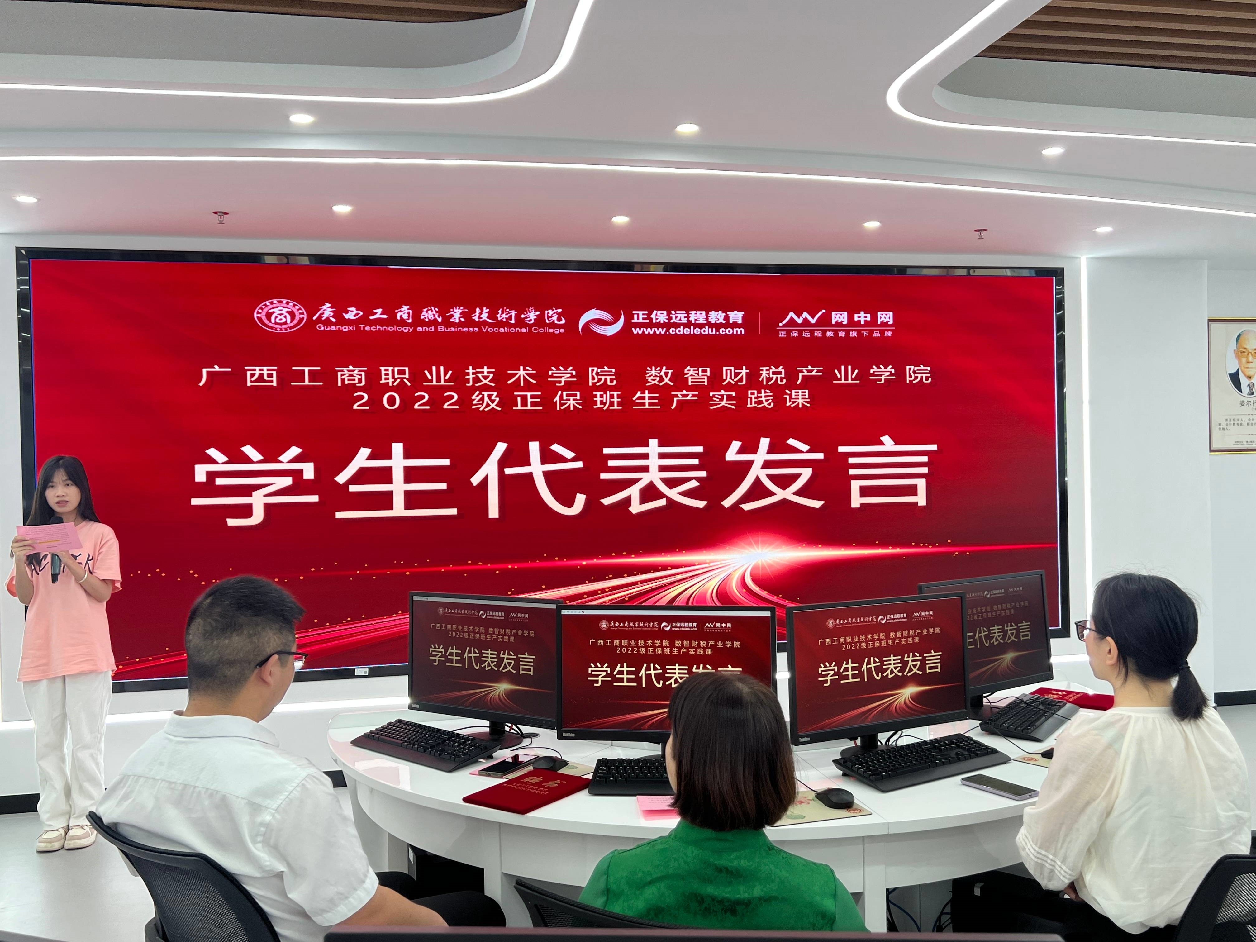 為進(jìn)一步完善學(xué)院課程體系建設(shè),深化產(chǎn)教融合、校企合作,探索產(chǎn)教融合新模式,推進(jìn)信息化技術(shù)發(fā)展與人才培養(yǎng)的貫通銜接。2024年5月27日上午,會(huì)計(jì)學(xué)院在武鳴校區(qū)A5-314財(cái)務(wù)云共享中心召開數(shù)智財(cái)稅產(chǎn)業(yè)學(xué)院2022級(jí)正保班生產(chǎn)實(shí)踐課開班儀式,會(huì)計(jì)學(xué)院院長(zhǎng)粟衛(wèi)紅、副院長(zhǎng)譚玉娥、正保遠(yuǎn)程教育廈門網(wǎng)中網(wǎng)軟件有限公司西南大區(qū)總經(jīng)理胡世杰等相關(guān)負(fù)責(zé)人及2022級(jí)正保班同學(xué)出席開班儀式。會(huì)議由會(huì)計(jì)學(xué)院教務(wù)科研科科長(zhǎng)梁亞兵主持。