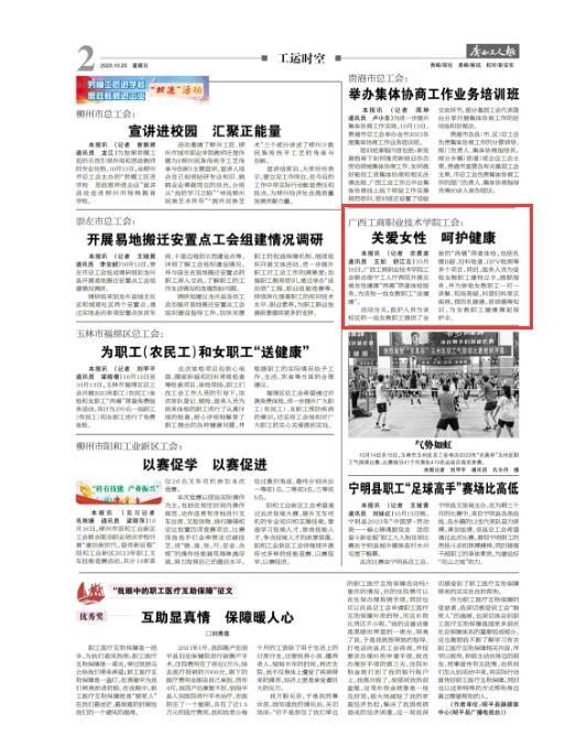 本報訊 (記者 農(nóng)晨迪? 通訊員 王如 舒江云)??10月16日,廣西工商職業(yè)技術學院聯(lián)合南寧工人療養(yǎng)院開展關愛女性健康“兩癌”篩查體檢服務,為該校一線女教職工“送健康”。