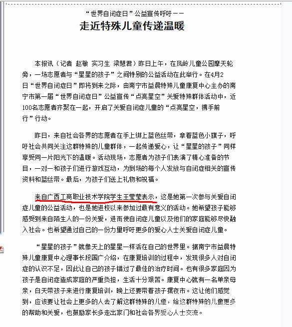 • 2015年3月29日,由南寧市益晨特殊兒童康復(fù)中心主辦南寧市民政局與南寧市殘疾人聯(lián)合會(huì)承辦的“點(diǎn)亮星空,攜手前行!”公益計(jì)劃——南寧市第一屆“世界自閉癥日”公益活動(dòng)在南寧市鳳嶺兒童樂園舉行,我院紅十字會(huì)服...