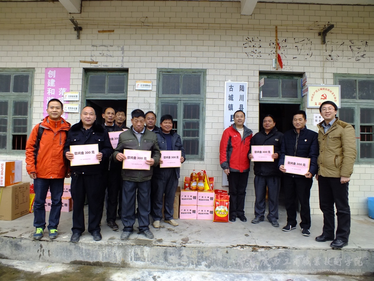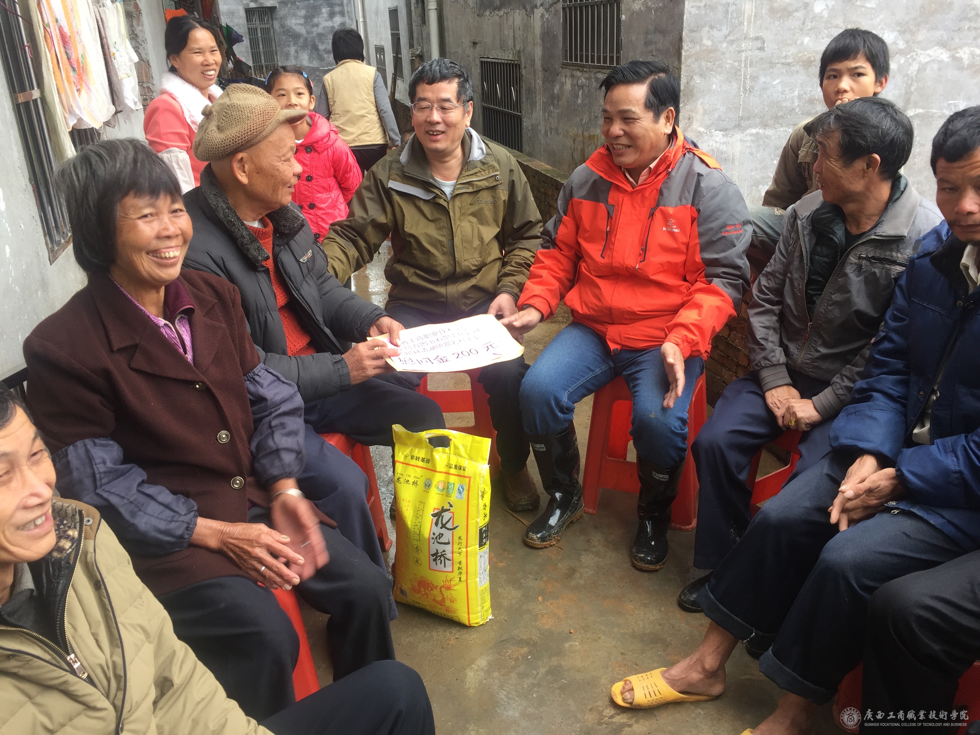 • 春節(jié)前夕,教務(wù)科研處黨支部、學(xué)工處黨支部與陸川縣水亭村黨總支、那若村黨總支、南寧培育圖書(shū)有限責(zé)任公司聯(lián)合開(kāi)展了“扶貧濟(jì)困送溫暖”活動(dòng),為水亭村、那若村9戶貧困戶和1戶困難黨員各送去200元慰問(wèn)金、一帶大...