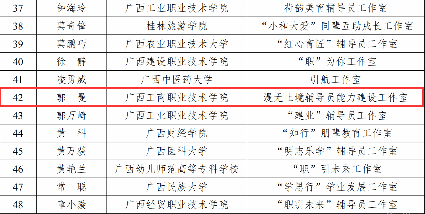 • 近日,《自治區(qū)教育廳關(guān)于公布第二批高校高水平輔導員工作室培育建設項目名單的通知》(桂思政[2024]11號)發(fā)布,經(jīng)推薦申報、專家評審、線上答辯等環(huán)節(jié),我校漫無止境輔導員能力建設工作室成功入選第二批廣西高...