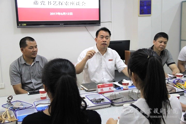 • 2017年6月13日下午,我院院長陳杰教授在校本部教學樓會議室與廣商院師生共同進行書法變革與藤瓷書藝探索,并給大家?guī)硪粓鼍识毦邉?chuàng)意的文化盛宴。 主持人李紅梅教授在講座開始前,對陳杰教授的介紹...