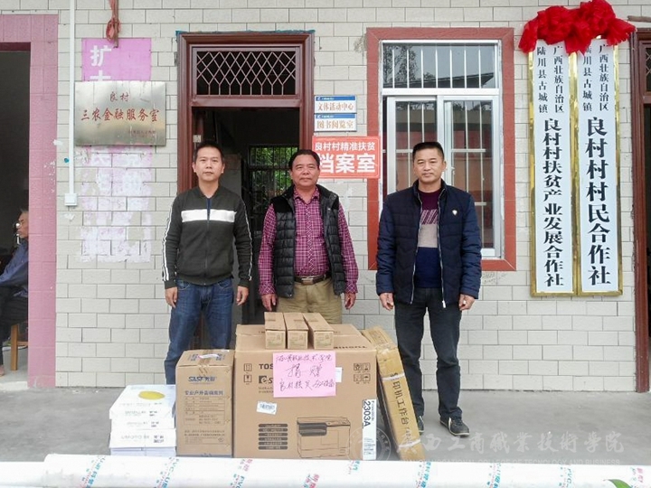 • 11月上旬,廣西工商職業(yè)技術(shù)學院將價值9萬多元的多功能復印機、電腦、打印機、空調(diào)等一批辦公用品分別送至學院定點幫扶的貧困村陸川縣馬坡鎮(zhèn)靖西村、珊羅鎮(zhèn)四樂村、清湖鎮(zhèn)水亭村、清湖鎮(zhèn)那若村、古城鎮(zhèn)八角村、古...