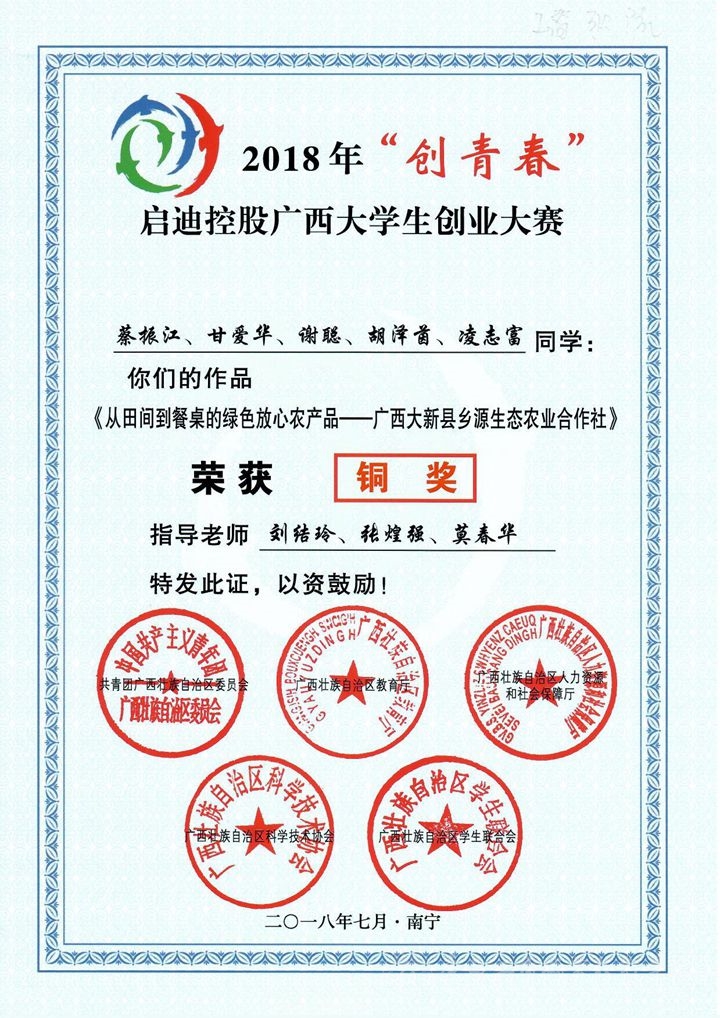• 近日,共青團(tuán)廣西區(qū)委、自治區(qū)教育廳、自治區(qū)人力資源和社會(huì)保障廳、自治區(qū)科協(xié)、廣西學(xué)聯(lián)共同公布了2018年“創(chuàng)青春”啟迪控股廣西大學(xué)生創(chuàng)業(yè)大賽結(jié)果通報(bào),我院蔡振江、李霖、黃體華等多名學(xué)子在2018年“創(chuàng)青春...
